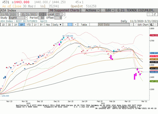 Nisan vade BIST30 endeksi seansında 1440-1444 içinde dar bir aralıkta fiyatlandı. Spot piyasa öğeleden sonra gelen alımlar ile Koç grubu hisse senetleri önderliğinde güç topladı ve artı kapamayo başardı. Ancak vadeli BIST30 pozitif fiyatlama için isteksizdi. Gelişen ülke piyasaları nezdindeki harekette Pazartesine benzer bir seyir vardı. Hindistan, Güney Kore, Arjantin ve Brezilya %1.00 üzerinde pozitif seyirdeydi. Türkiye'nin de içinde olduğu diğer piyasalarda ise hafif artılar veya eksilerin olduğu kapanış gerçekleşti. Bugün küresel hisse senedi piyasaları ABD Başkanı Joe Biden'ın Pittsburg'da yapacağı açıklamalara kitlenecek. ABD aşılama sürecinde 19 Nisan tarihine kadar yetişkin grubun %90'ını aşılamış olmayı planlıyor. Başkanın aşılama süreci yanında trilyonlarca dolarlık altyapı yatırım paketi açıklaması bekleniyor. Paketin ABD ekonomisinde verimliliği artıracağı ve yeni iş olanakları ile istihdam piyasasına katkı sağlayacağı düşünülüyor. ABD tarafında Nisan ayında sosyal haklar adına yapılacak düzenlemeler ve değişik gelir grupları arasında açılan farkı gidermeye yönelik düzenlemeler ve vergi konusu ile beklentiler bitmiyor. Kısaca son haftalarda yaşanan bant içi hareket ve dinlenme sürecine rağmen ABD hisse senedi piyasaları yükseliş eğilimini sürdürebilir. Avrupa endekslerindeki kapanışa bakınca da benzer bir tablo görüyoruz. Avrupa borsalarının tamamı günü değer kazancı ile tamamladı. Avrupa tarafında artan covid-19 vaka sayısı ile ekonomiler tam olarak açılamadı. Ancak hisse senedi piyasaları yılın geri kalanında muhtemel ekonomik iyileşmeyi şimdiden fiyatlıyor. Ululararası kurumların tahminlerinde gelişen ülke ekonomilerinin pandemiden çıkışta zorlanacağı beklentisi vardı. Son haftalarda yaşanan harekette gelişen ülke piyasaları geriden geliyor ve sanki bu beklentiyi doğrularcasına bir fiyatlama yapıyor. Türkiye'ye gelince durum biraz daha faklı yatırım bankası Goldman Sachs 2021 büyüme tahminin %5.5'ten %3.5 olarak aşağı yönde güncellendi.