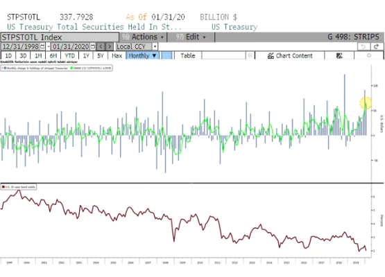 Ocak ayı verilerine göre Amerikan Tahvil ve Bono piyasasında uzun vadeli tahvillere para girişinin sekizinci ayda da devam ettiği anlaşılıyor. Uzun vadeli tahvil talebinde emeklilik fonları başı çekiyor. Detaylara bakıldığında emeklilik fonları uzun vadeli tahvil alımları son üç aylık ortalamada 6.5 milyar dolar artış ile rekor seviyeye ulaştı. Küresel olarak negatif faiz oranı ileriye dönük Merkez Bankalarının politika faizini daha aşağıya çekeceği beklentisi ile tahvil bono piyasasında oranlar geriliyor. Buna rağmen talepte artış var. Amerika'da 2019 senesinde özel emeklilik fonları ağırlığı hisse senedinden bono piyasasına kaydırmış. Kuşkusuz içeriği itibari ile daha güvenli tarafta kalmak isteyen emeklilik fonları tahvil bono piyasasında daha kesin bir kazanç görüp potansiyeli bu tarafı tercih etmiş . Tahvil bono piyasası küresel piyasalarda akıllı yatırımcı kimliği ile bilinir ve buradaki fiyatlamaların ekonomiye dair doğru tespit içerdiği varsayılır. Bu durumda mevcut düşük faiz ortamında Amerikan uzun vadeli tahvillerine olan talep ile enflasyon beklentisi olmadığını ve ekonomik koşullara güvenilmediğini söyleyebilir miyiz? Normal şartlarda öyle olmalıydı ancak Merkez Bankaları kolay para politikaları dengeleri bozdu ve bu fiyatlama ileriye dönük durgunluk endişe mi yoksa tahvil piyasası alternatifsizliği fiyatlıyor ve zamanla normalleşme gelecek mi? Amerikan Merkez Bankası FED tahvil piyasasındaki fiyatlamanın zamanla normalleşeceğini düşünüyor. Olabilir ama geçmiş on seneye baktığımızda uzun zaman alacağını söyleyebiliriz.