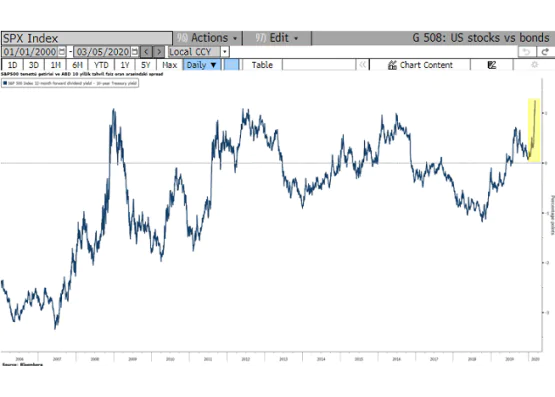 Tahvil piyasasında son dönem oranlarda yaşanan geri çekilme sonrasında S&P500 içerisindeki hisse senetlerinin 12 aylık temettü verimi ile 10 yıllık tahvil getirisi arasındaki fark rekor seviyeye ulaştı.