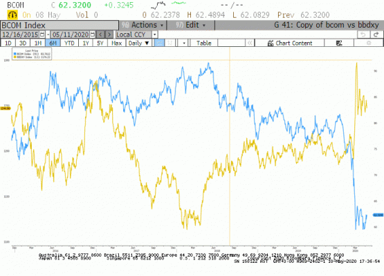 Küresel piyasalarda korunan nadir korelasyonlardan biri dolar endeksi ve emtia piyasası arasındaki ters korelasyon diyebiliriz. Yukarıdaki grafikte Mart ayı boyunca yükselen ve 23 Mart tarihinde zirve yapan Bloomberg Dolar Endeksi (BBDXY) etkisi aynı zaman dilimi içerisinde Bloomberg emtia endeksinin (BCOM) 59.50 düşük seviyesine doğru gerilemesini sağladı. Emtia piyasasında fiyatlamalar küresel para birimi olan Amerikan Doları cinsinden ve bu tarafta baskı kacınılmazdı. Bu duruma küresel ekonomik yavaşlama ve ürün yelpazesinin nerede ise tamamında etkili olan düşük talep beklentisi eklenince emtia piyasasında fiyatlar sert bir şekilde geriledi. Mayıs ayına girildiğinde hem covid-19 önlemlerinin kademeli olarak geri çekilmeye başlanması hem de talep tarafındaki kıpırdanma ile emtialar alıcıların dikkatini çekmeye başladı. Talep tarafında iyileşme BBDXY tarafında geri çekilme ile desteklenirse özellikle tarım ürünleri ve endüstriyel metaller tarafında yukarı yönlü hareketlenme görülebilir.
