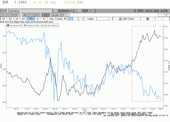 25 Ağustos haftasının derinlik raporunda vadeli ve opsiyon piyasasında Euro toplam spekülatör net uzun pozisyon miktarı 270,987 kontrat ile 52 haftanın yüksek seviyesinde açıklandı. Son dört haftada IMM'de toplam spekülatör net uzun pozisyon miktarında 22 bin kontrat artış gerçekleşti. Hafta başında yüksek fon net uzun pozisyon miktarı ile aşırı alım bölgesinde olan Euro destek seviyelerine doğru geri çekildi sonrasında FED Başkanı açıklaması ile zayıf dolar süreci destek bulurken parite 1.1900'un yolunu tuttu. Avrupa Merkez Bankası finansal kesime likidite desteğini sürdürürken euribor borçlanma faiz oranı tarihi düşük seviyelerine geriledi. Ekonomik verilerde tüketici ve iş dünyası güven endekslerindeki artış bölgenin para birimini destekliyor. Öte yanda geçmiş dönem rekor yüksek fon net uzun pozisyon miktarı dönemleri ile kıyaslanınca açık pozisyonda artış potansiyeli var. Bütün bunları bir araya getirdiğimizde derinlik raporunun +%5 marjını kullanacağını ve euro/dolar paritesinin 1.2000 üzerine yerleşeceğini düşünüyoruz. Hal böyle iken Euro Bölgesi'nin para biriminin güçlenmesi ihracat potansiyeli üzerinde olumsuz etki yapabilir. İleriye dönük şirket 12 aylık hisse başı kar beklentilerinde aşağı yönlü güncellemeler yapılıyor. Yukarıdaki grafikte Euro/dolar paritesinde yükseliş ile Euro Stoxx 50 S&P500 performansında aşağı yönlü hareket dikkat çekiyor. Güçlü Euro'nun yansıması ile endeks son dönemde Amerikan hisse senedi piyasaları performansının gerisinde kaldı.
