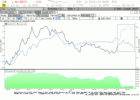 Geliişen ülke para birimleri performansında Güney Afrika Randı ve Türk Lirası arasındaki pozitif korelasyon bilinen bir gerçek iken son dönemde Türk Lirası'nın değer kaybına ZAR iştirak etmeyerek Amerikan Doları karşısında değer kazandı. Bu ayrışmasın bir miktar abartılı olduğunu ve önümüzdeki iki haftada bu iki para birimi arsındaki korelasyonun pozitife döneceğini tahmin ediyoruz.
