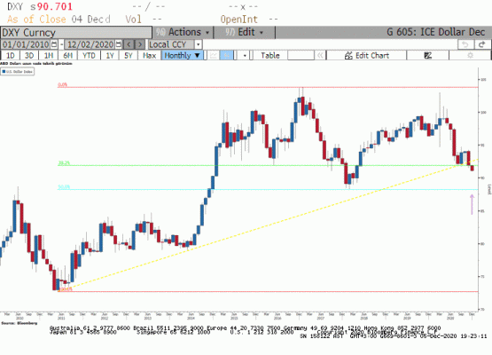 Geçtiğimiz hafta genelinde döviz piyasasında ABD Doları değer kaybı ve Brexit ile Sterlin ve aşı haberleri ile Euro tarafında yükseliş vardı. Bunun yanında Kanada Doları 2018'den bu yana ABD Doları karşısındaki en yüksek değerine yükseldi. Küresel hisse senedi piyasaları ABD endeksleri önedrliğinde yülselişini sürdürdü. Ancak Alman DAX endeksi bu yükselişe katılmakta zorlanıyor. İkinci teşvik paketine ilişkin görüşemler yeniden başlamış görünüyor. Son olarak 900 mia dolarlık bir teşvik paketi konuşuluyor. Bu haber akışının kıymetli metal piyasasında altın ve gümüş fiyatlamasına olumlu yansıdığı görülüyor. ABD Başkanı'nı seçti ancak senatoda ki koltuk dağılımı henüz kesinleşmedi.Bu şartlarda kongreden teşvik paketinin geçmesi kolay değil ancak Kasım ayı istihdam piyasası raporu ardından en azından çaba artacaktır.