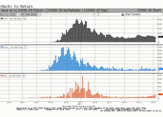 Amerika NY'ta 15 Nisan tarihinde 11,400 artış gösteren virüs vaka sayısı 2 Temmuz tarihinde 654 olarak gerçekleşti. New York eyaleti covid-19 salgınını kontrol altın almış görünüyor. Öte yanda diğer eyaletlerde gözlenen yükseliş ile Amerika genelinde 2 Temmuz'da 51,800 olan vaka sayısının sonraki gün 52,843 olarak gerçekleşti. 4 Temmuz bağımsızlık günü nedeni ile 3 günlük uzun hafta sonu tatilinin olduğu dönemde virüs vaka sayısındaki artış önemli. Diğer tarafta Almanya önceki güne göre 477 virüs vaka sayısı Japonya sadece 196 yeni vaka sayısı ile salgını kontrol altına almış görünüyor.