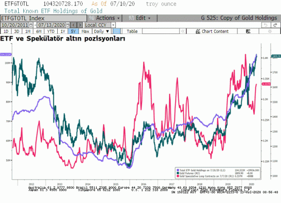 Altın piyasasının başrol oyuncularının 2020 yılı boyunca pozisyon değişimlerini zaman içerisinde aktarmaya çalıştık. Güncelleme yaparsak, yılın ilk beş ayında Merkez Bankaları altın rezervlerinin 323 ton arttığı anlaşılırken, Merkez Bankaları rezervleri 2015 yılından bu yana en yüksek artışı gösterdi. Borsa Yatırım fonları (ETF) araçlığı olan alımlar ise yaklaşık 734 ton olarak gerçekleşti. 2009 senesinde ETF fonlar aracılığı ile altın yatırımda artış 87 ton iken bu sene fon alımları ile altın yatırımcısı bir rekora imza attı. Bir başka dikkat çeken ise Comex’te 33.5 milyon onsa yükselen stok rakamı oldu. Altın fiyatlarında 2019 Mart ayında başlayan yükseliş ile son 12 aylık dönemde işlem hacimleri ve açık pozisyon sayısında artış da rekora koştu. 07 Temmuz tarihli derinlik raporunda Comex’te fonlar ve küçük spekülatörler 330,141 kontrat net uzun pozisyon taşıyorlar. Bu rakam ile piyasanın rekor seviyelerin yaklaşık 100 bin kontrat altında olduğunu görüyoruz. Comex pozisyonlarının son dönemde ETF trendinden bir miktar ayrıştığı söylenebilir. Buna rağmen her koşulda mevcut yükselişin devam ederek fon net uzun pozisyon miktarının yeni rekorlar kıracağı söylemek mümkün.