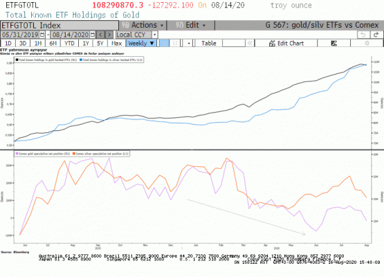 ETF'ler ile vadeli piyasalarda toplam spekülatör net uzun pozisyon miktarı Temmuz ayından bu yana farklı yatırım davranışı gösteriyor. Ancak burada dikkat çeken altın ETF miktarında limitli geri çekilmeye rağmen gümüş ETF'lerine girişin devam ediyor oluşu. Kısa vadede her iki ürün için geçtiğimiz haftanın üzerinde kapanış beklemiyoruz. Uzun vadeli yükseliş trendini bozmayacak bir geri çekilme ve dengelenme dönemi beklentimiz var. Öte yanda xau/xag rasyosunda düşüşün devam edeceği yönünde sinyaller güçleniyor.