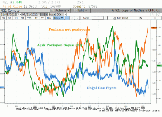 15 Eylül haftasının derinlik raporunda vadeli ve opsiyon piyassaında doğalgaz net uzun pozisyon miktarı 17.858 kontrat artış ile 76.345 kontrata yükseldi. Piyasada yaşanan satışların bu tarihten sonra yaşanması ile önümüzdeki haftanın raporunda fon pozisyonlarında ciddi bir düşüş olacağını tahmin ediyoruz. 15 Eylül tarihinde son 52 haftanın rekor net uzun pozisyonu ile aşırı alım bölgesinde olan piyasa düzeltme sürecine girdi. Yakın vadede yaşanan sert geri çekilme hareketine bakılırsa piyasa oyuncuları önümüzdeki aylarda daha düşüşk seviyelere göre oyun kuruyor.