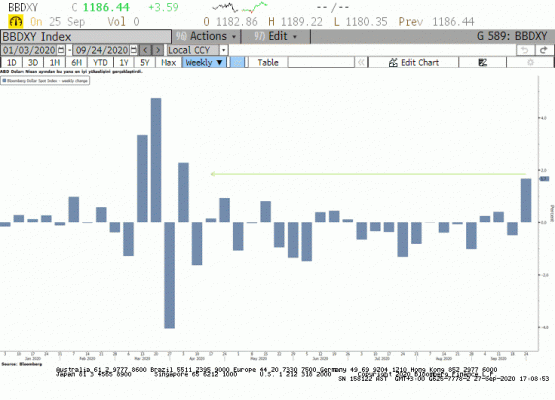 ABD Doları'nın ticaret ortağı olan 10 büyük ekonominin para birimine karşı değerini gösteren Bloomberg Dolar Endeksi (BBDXY) Nisan ayı'ndan bu yana geçtiğimiz hafta en sert yükselişini yaptı. Haftaya 1163 seviyesinde başlayan endeksin kapanışı 1186 olarak gerçekleşti. BBDXY için 1180 kısa vadeli destek olmak üzere bu seviye üzerinde kaldığı sürece 1200 ara direnç olmak üzere 1210 direncine doğru yükseliş sürebilir.